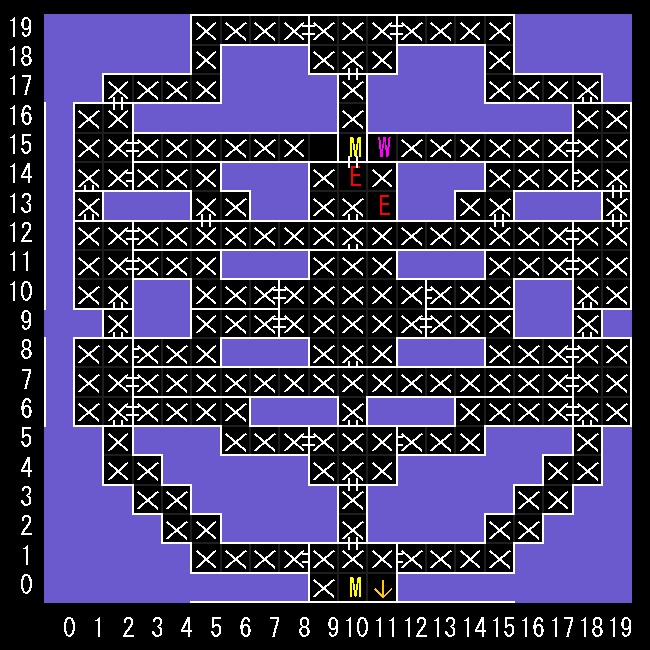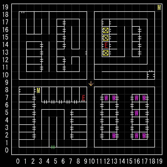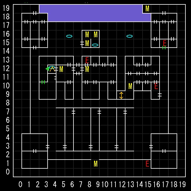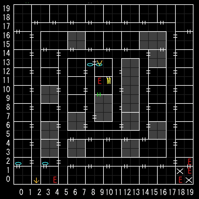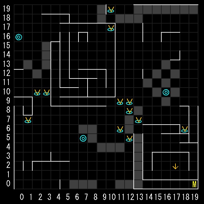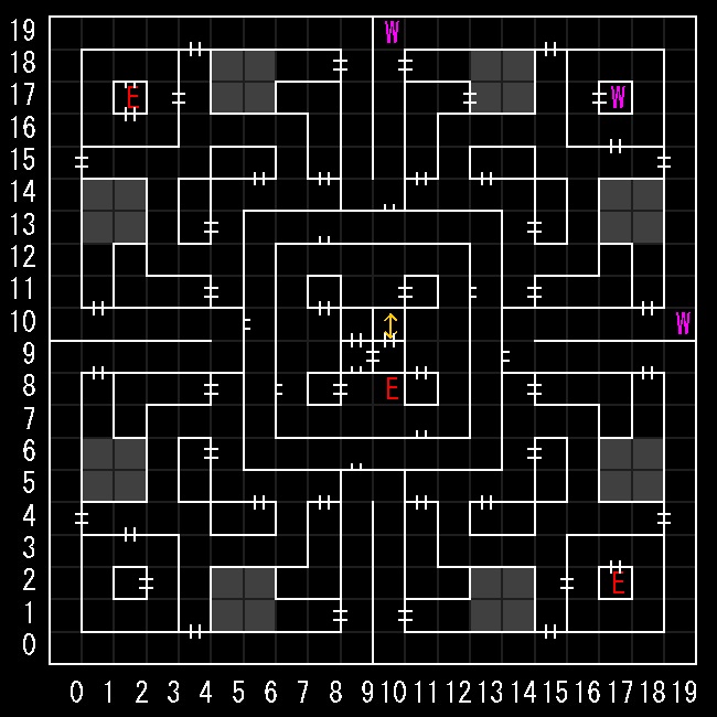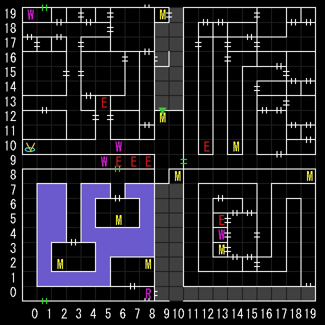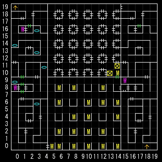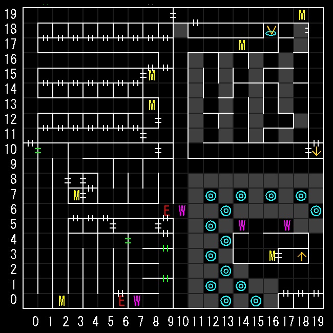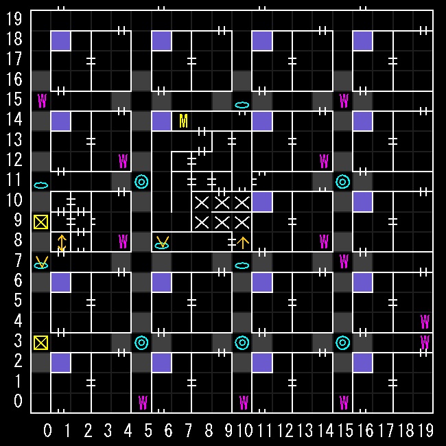 | 座標の読みは(横.縦) ↑=上り階段 ↓=下り階段 W=ワープ E=人・イベントなど M=掲示板 R=街へ帰還 ∨=シュート(下層へ落ちる) ∧=シャフト(上層へ飛ぶ) 半扉=一方通行 緑扉=隠し扉 グレーゾーン=暗闇 楕円=ダメージ床 ◎=回転床 ☒=呪文禁止 ✕=テレポート不可 |