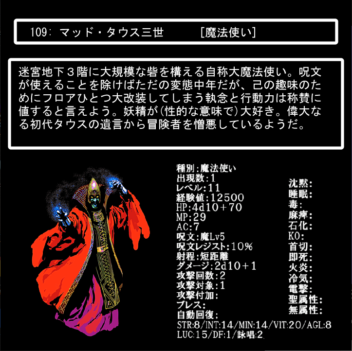 アイテム図鑑やモンスター図鑑もあり、それぞれに解説がつく。モンスター図鑑には、遭遇したモンスターのステータスも記載。ダンジョンイベントも豊富で、会話キャラのグラフィックもある。各フロアに、FOE的な雑魚が1種類ずつランダムに出現する。リドルが多め。THE KINGのプレイ後に遊ぶのがお勧め。