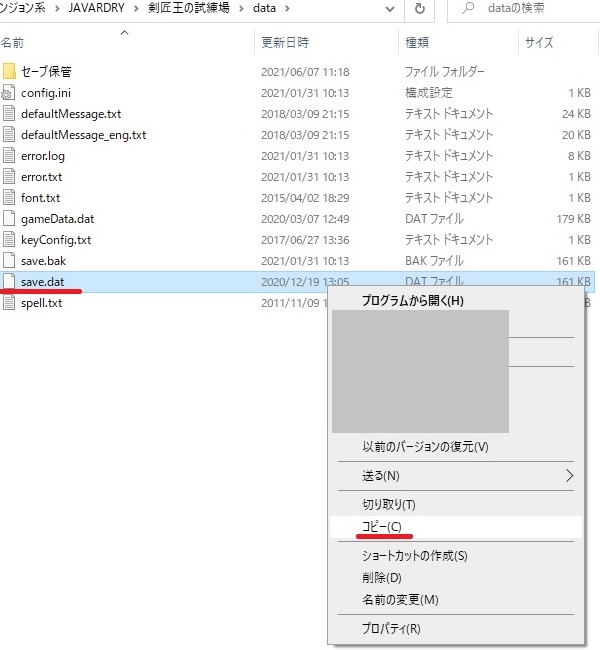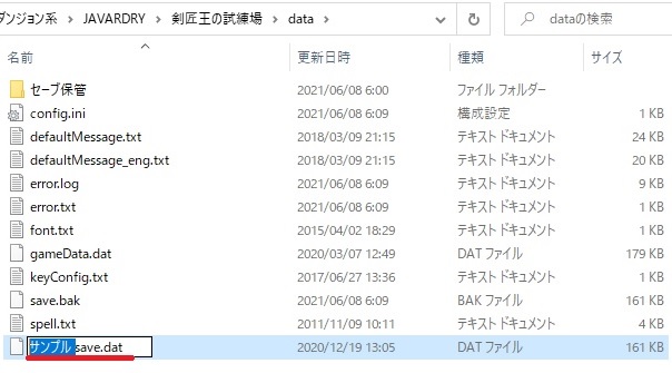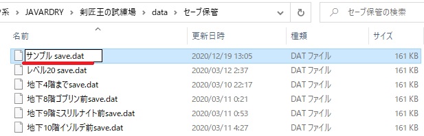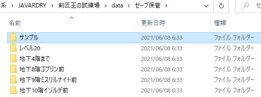 一例として、剣匠王の試練場で行ってみます。セーブ保管フォルダは予め作ってあります(名前は何でもOK、またフォルダの場所もどこでも可能です)。dataフォルダ内にある、save.datファイルをコピーします。