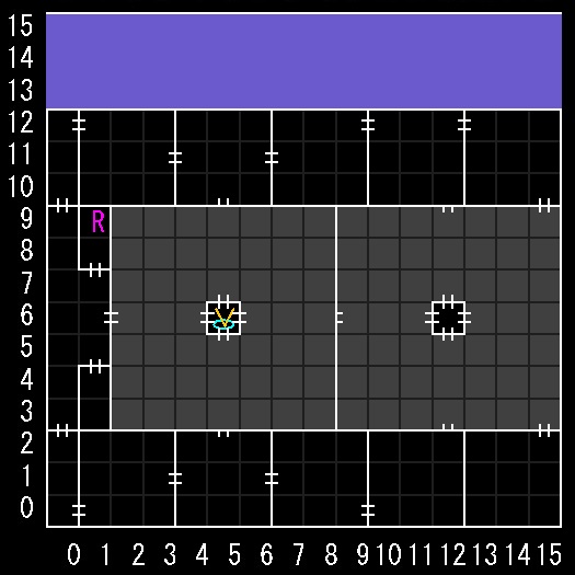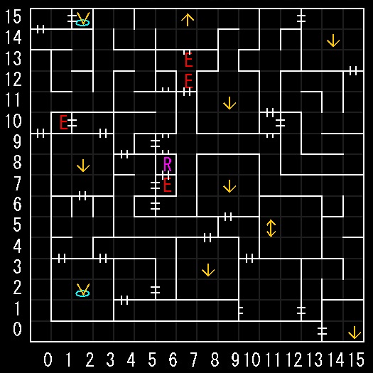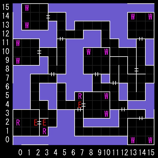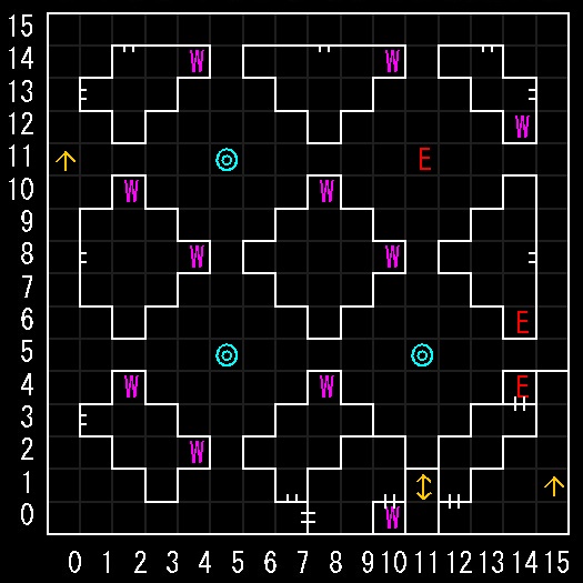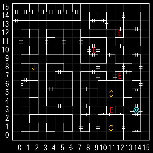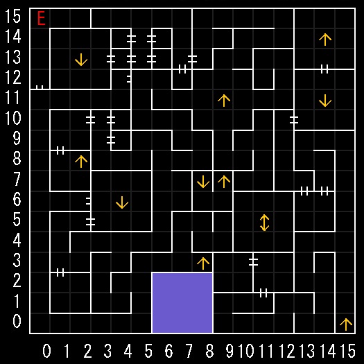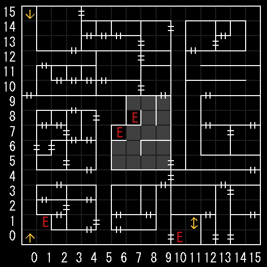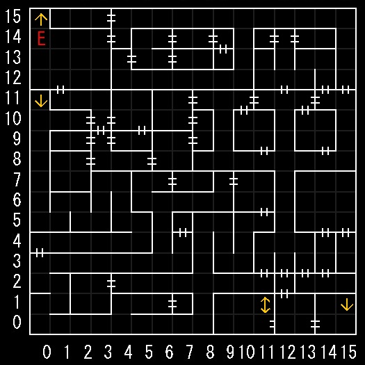 | 座標の読みは(横.縦) ↑=上り階段 ↓=下り階段 ⇅=エレベーター W=ワープ E=人・イベントなど R=街へ帰還 ∨=シュート(真下へ落ちる) 半扉=一方通行 グレーゾーン=暗闇 楕円=ダメージ床 ◎=回転床 ▲▼=シャッター(一方通行) |