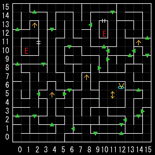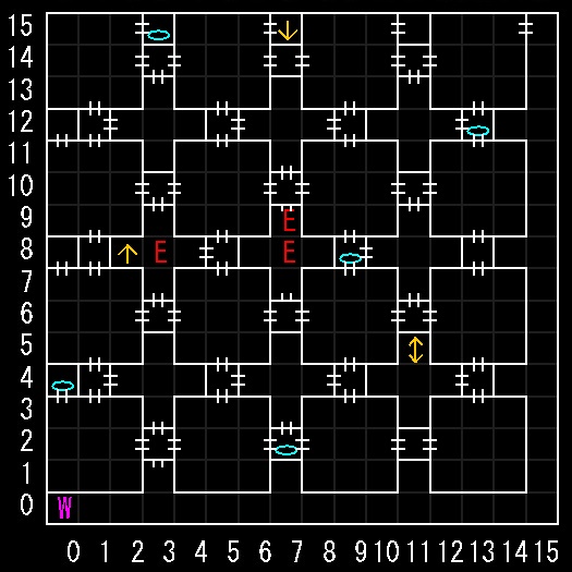 | ポイント | 各部屋のワープは先に進むか入口に戻るかの二択。 以下が先に進むワープ。 (10.03)→(07.03) (13.00)→(12.04) (08.10)→(11.07) (13.14)→(13.08) (01.15)→(05.11) (00.09)→(04.07) (07.03)(12.03)(11.06) (14.08)(05.12)(04.08)→隠し扉 (02.02)→ラスボス。倒すとダイヤの時計。 城に持ち帰ると、10万経験値と10万Gをもらえる。 その後は自由に冒険。ボスも復活。 ラスボスはHPが少なく、高レベルの魔法1発で倒れる。 取巻きの数はランダムなので、リセットや逃走で減らすと楽。 |