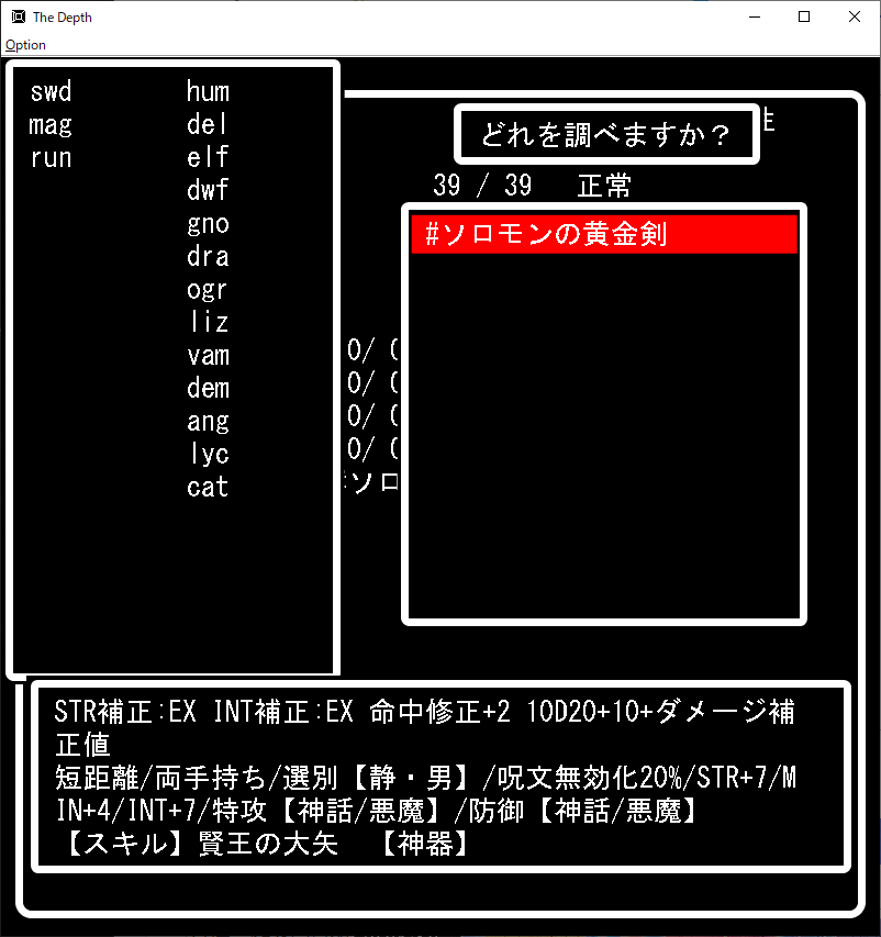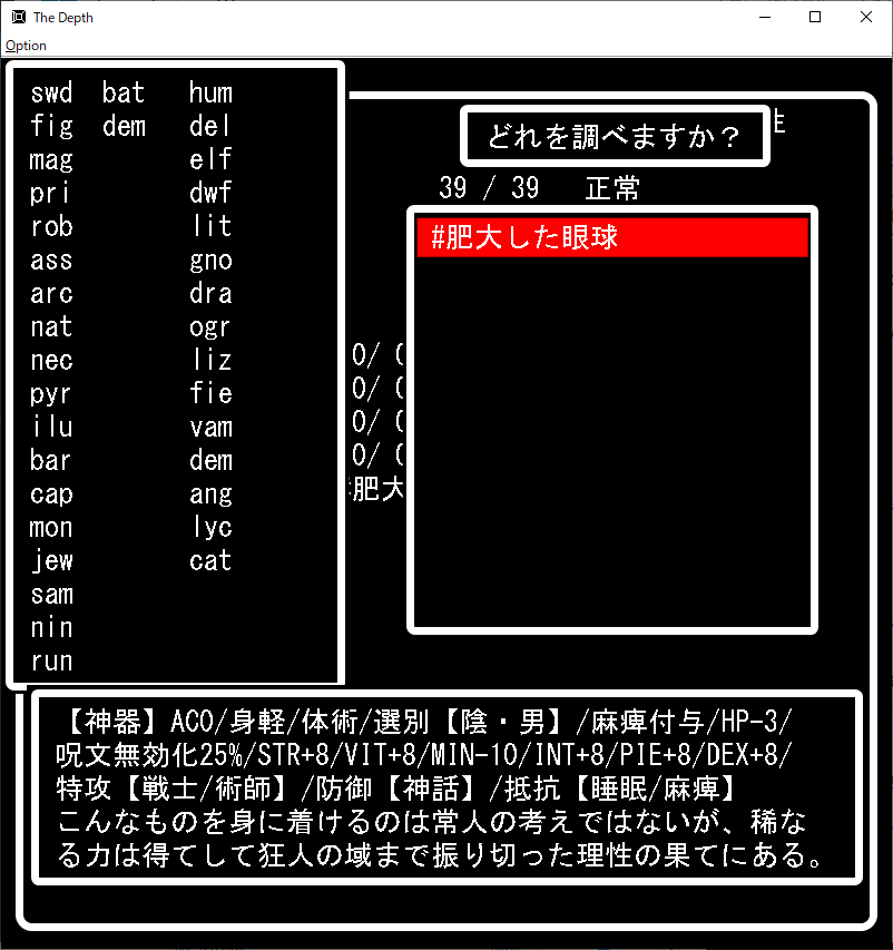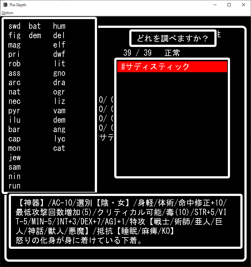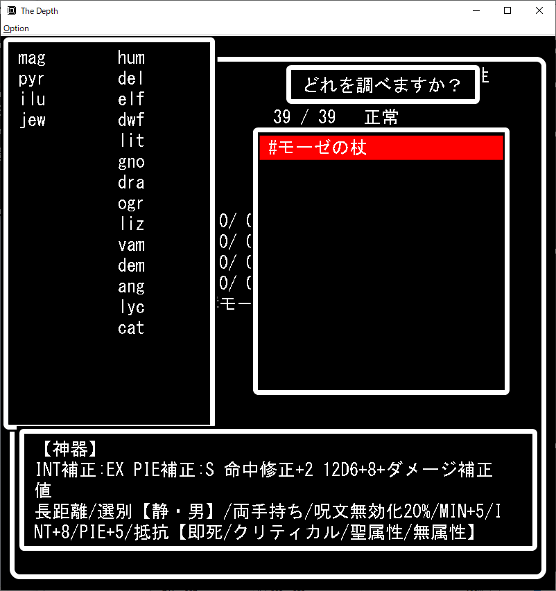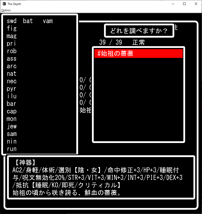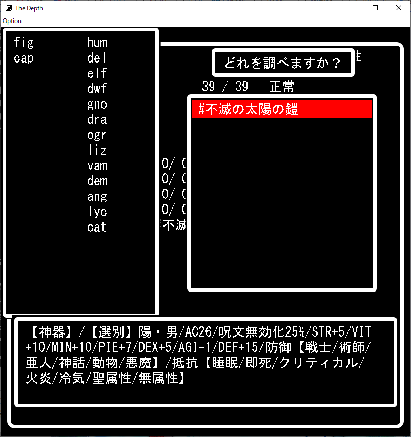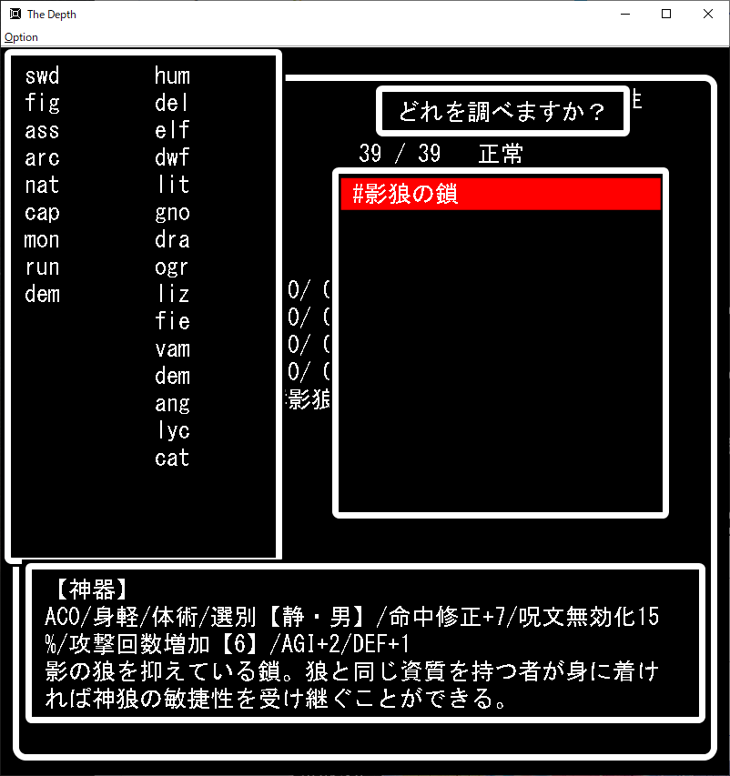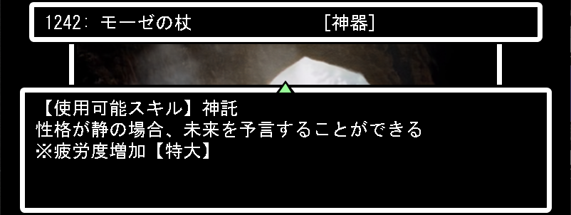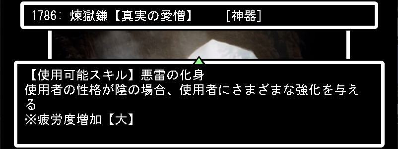 | 神器は、怪異などの難敵がたまにドロップする強力な装備品です。装備条件が厳しく、職業・種族に加え、性格・性別も合わないと装備できません。ただし、性別以外が合致していれば、所持することでスキルの使用は可能です(スキルのある神器のみ)。本作には、性格や性別を変える手段は存在しないため、神器を装備したければ、その条件に合わせたキャラ選びかキャラ作りが必要になります。また、神器も未鑑定状態で手に入りますが、自分で鑑定することは出来ず、雑貨店で鑑定してもらう必要があります。 紹介順は、神器の中では手に入れるのが易しめのものから並べています。パーティの組合せによる相性もあるので、必ずしもこの通りになるとは限りません。簡単なものだと、装備品の整い具合にもよりますが、レベル15辺りから狙えます。難しいものは、レベル30以上は必要です。 モンスター名の後ろの数字は、モンスターカタログの番号です。 装備可能は、酒場の初期メンバー+ダンジョン内で仲間になるオリジナルキャラで記載します。訓練所での作成キャラも、条件が合えば装備可能です。 スキル可は、装備可能キャラ+装備不可だがスキルのみ使用可能のキャラで記載します。 |