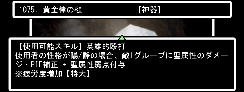 | スキル「英雄的殴打」 敵グループに5~40+PIE×2の聖属性ダメージ+聖属性弱点付与(3T) LVUPで威力上昇 ダメージはたまに抵抗される |