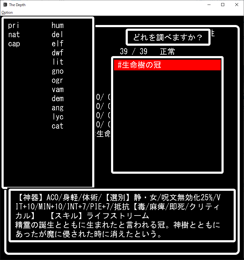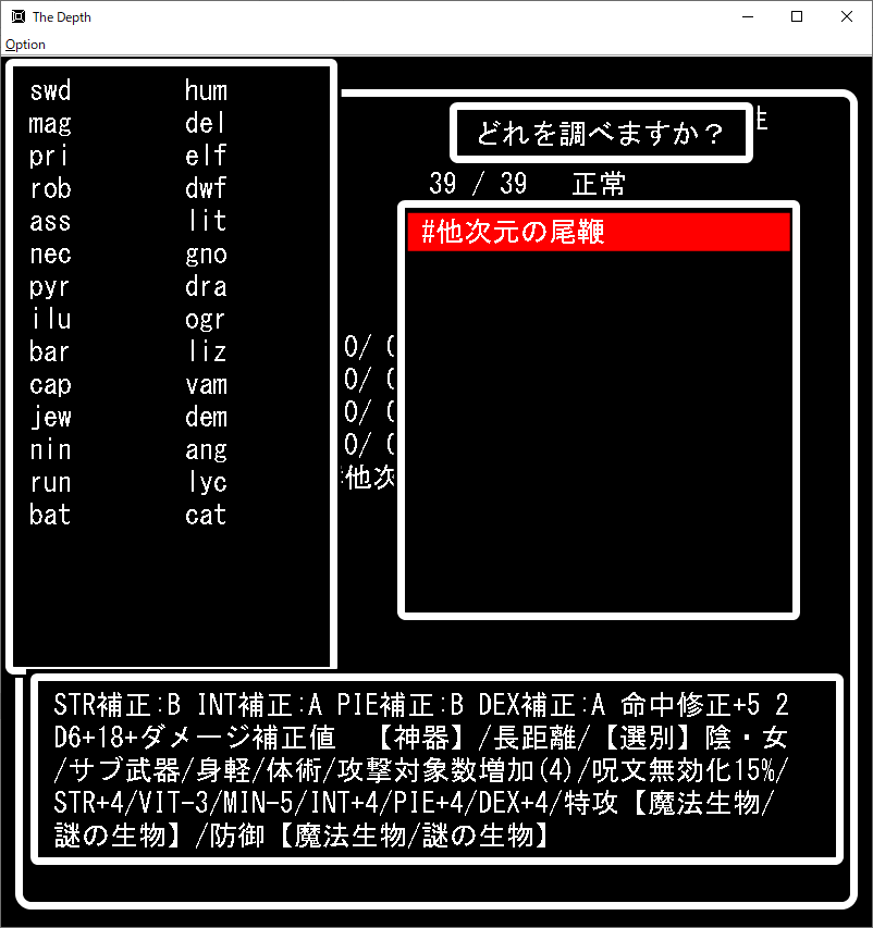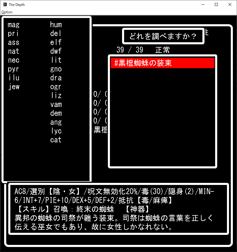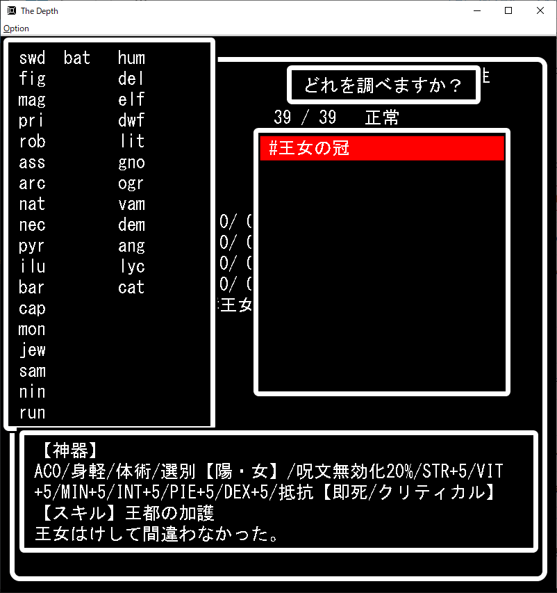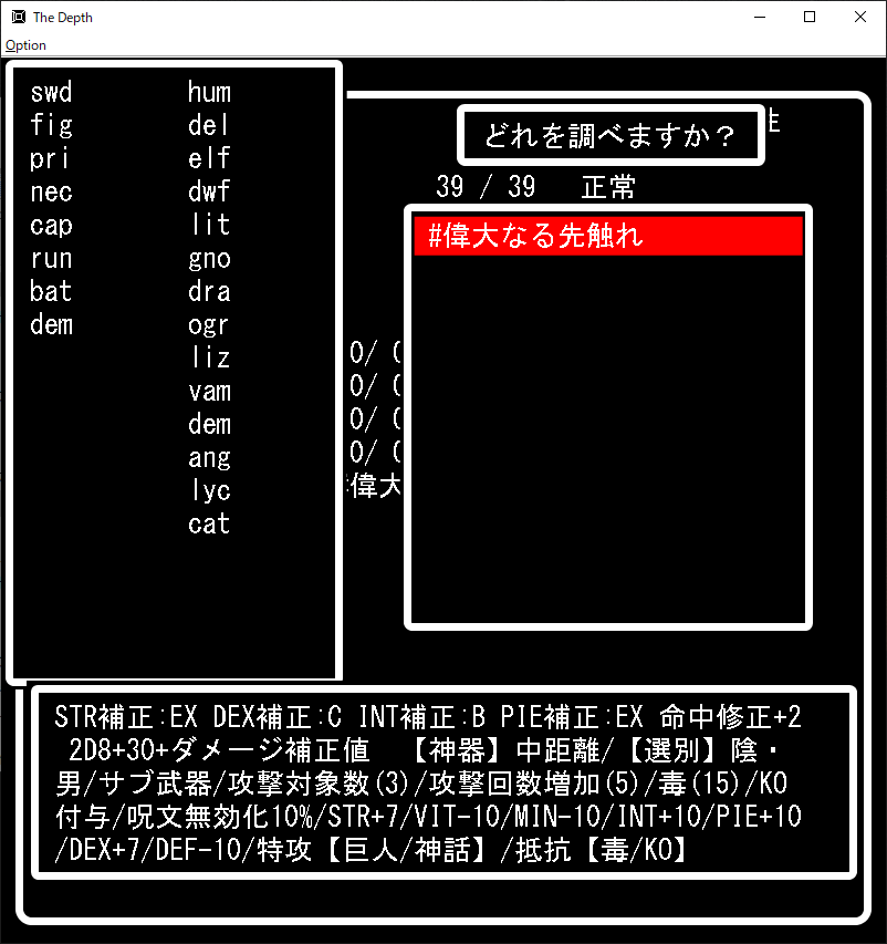 | スキル「神託」 3種類の予言から2種類がランダムに選ばれ、そのどちらかを選択する。 終末: 敵全体に1~200+INT×0.3の無属性ダメージ 抵抗されやすく、連続使用すると疲労で効果がなくなる 転移: 戦闘を抜けランダムにテレポート 街を経由しないエリアならどこにでも転移する可能性がある ただし、未到達エリア・不可侵エリアには転移しない 完全な防護: 味方全体に呪文無効化+100%・DEF+50・ブレス障壁(重複不可・1T) |