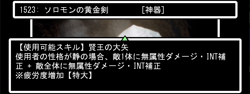 | スキル「賢王の大矢」 敵1体に3~36+INT×1.5の無属性ダメージ+ 敵全体に2~16+INT×0.7の無属性ダメージ LVUPで威力上昇 抵抗されることがある |