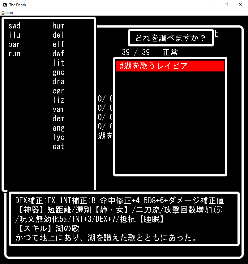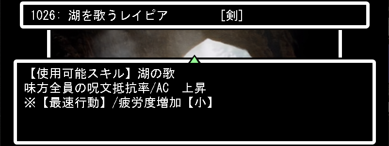 | スキル「湖の歌」 味方全体の呪文抵抗率を50%上昇・AC+10 重複不可・戦闘中永続 |