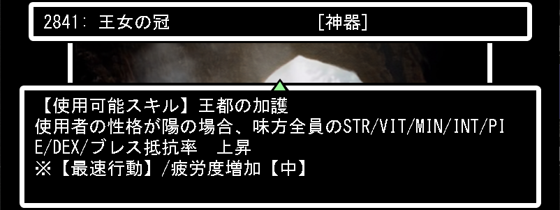 | スキル「王都の加護」 味方全体のSTR・VIT・MIN・INT・PIE・DEX+5・ブレス抵抗+80% 重複不可・戦闘中永続 |