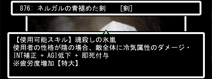 | スキル「魂殺しの氷嵐」 敵全体に3~60+INT×0.7の冷気属性ダメージ・AGI-2(重複不可・3T) 不死以外の敵全体に即死効果 LVUPで威力上昇 ダメージはたまに抵抗され、即死効果はよく抵抗される |