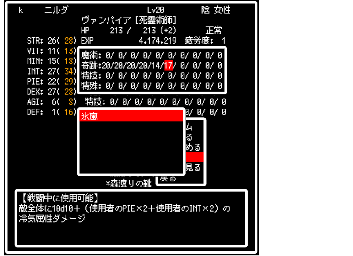 | 冷気の霧 | 戦闘 | 敵グループに2~20 +PIE×1.5+INT×1.5の冷気属性ダメージ +敵グループのAGI-1(1T) LVUPで威力上昇 ほぼ抵抗されない |