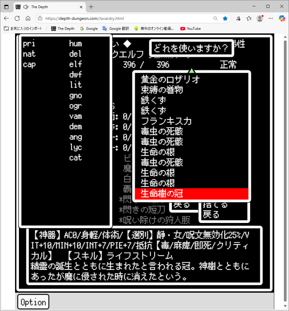 | 生命樹の冠(ユグドラシルのドロップする神器) スキル「ライフストリーム」は、5ターンの間パーティ全体を大きく持続回復してくれる。回復量はPIE依存だが、PIE50(補正込み)で毎ターン140程度の回復を見込める。重ね掛けで回復量の増幅も可能。使用できるのは、性格が静の神官・自然使い・隊長なので(男性は装備できないがスキルは使用できる)、条件が合うなら是非入手したい。神器なので入手は簡単ではないが、レベル20以上あれば狙える。強い怪異や伝説の怪異戦では、これがあるとないとでは安定度が全然違う。ただし、使用すると疲労度も大きく上がってしまうので、そこだけ注意。 |