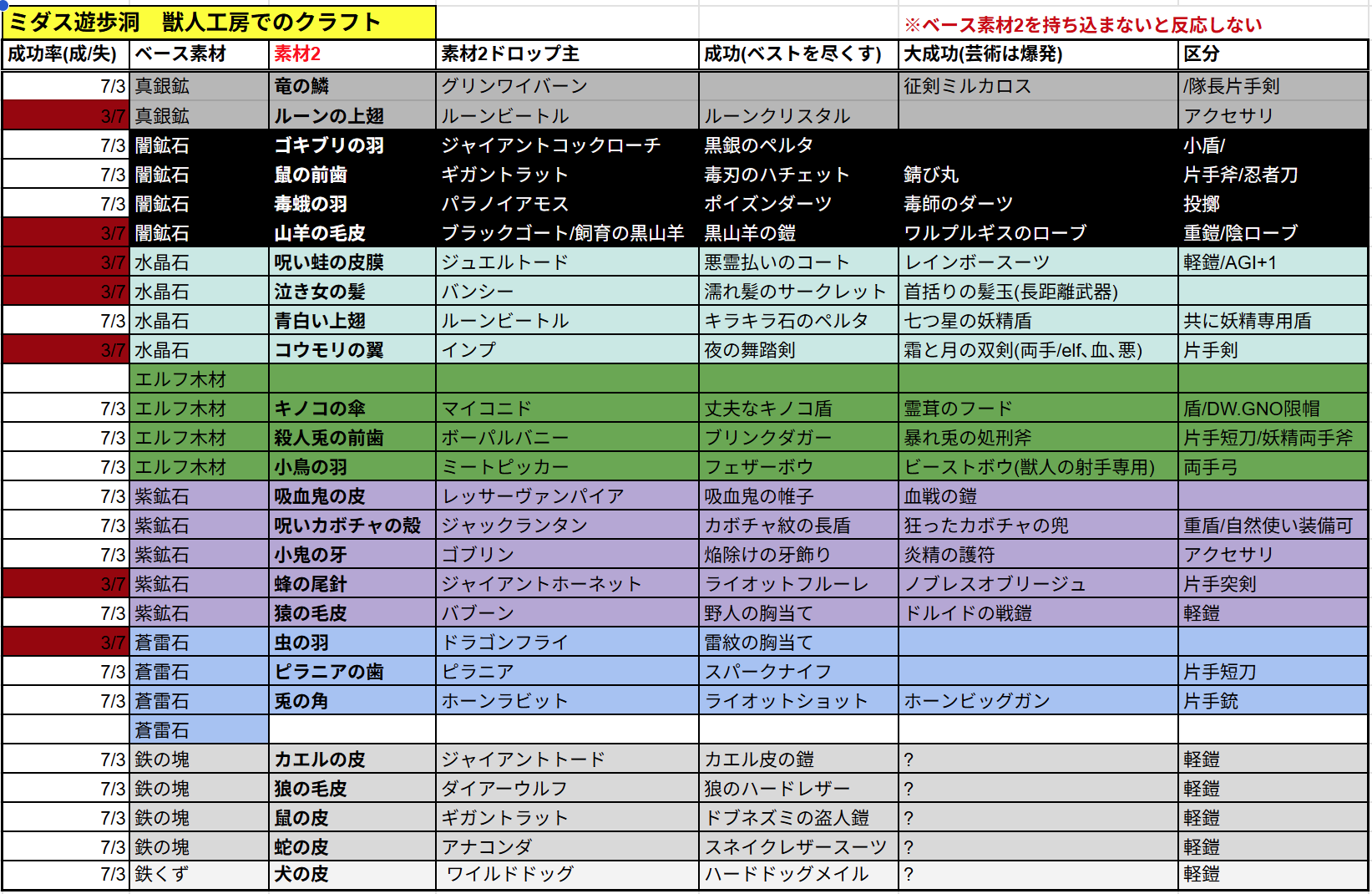 加工の体感ですが「大成功」確率にも各アイテムでかなりの差が設けられている気がします。