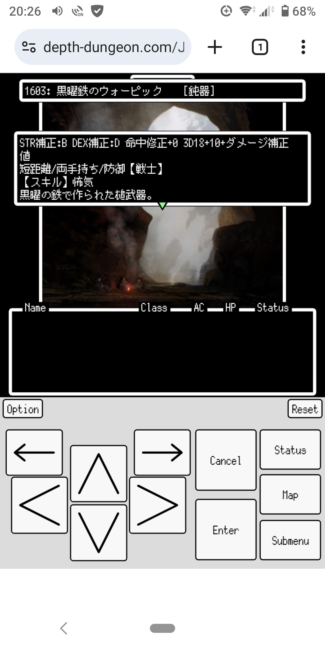 | 入口は(16.11)で、廃殿層(16.11)から入れる。 暗闇ゾーンが多いので、マップが埋まるまでは砕光石を使って進むのが無難。 (16.15):ゴミを漁ると、たまに熟練の調理器具が見つかる (14.14):呪い・炎・火種に関するアイテムを使うと、別のアイテムに変化する(ページ5に記載) (14.15):500GP払うと、1度だけ(01.05)からここへワープできる(ダンジョンを出ると再度払う必要がある)。 (18.19):嘲笑う瞳を倒すまではダメージを受ける。倒した後はダメージを受けなくなるが、先は現在未実装。 (02.19)→(00.19)へワープ(隠し扉を見つけるまで、歩いて戻ることはできないので注意) (00.18)→(03.03)へワープ (05.04):異邦の結晶+ランダム装備(術師系) (03.07):ゴブリン族の集団と強制戦闘(友好関係になると消滅)。また、友好関係になる前なら、周辺で消耗アイテムを発掘できる。 (02.06):1000G×人数分+ランダム装備 (04.08):ゴブリン族と強制戦闘の後、カンヌキを外すことができる。 (04.00):100GPで(15.19)にワープ(ただし失敗して違う場所に飛ばされることもある) (06.00):魔性の血を渡すと、ラミア族と友好関係になる。 (01.13):図書館館長クリフォトの依頼を受け、(00.08)で話した後に戻ると、酒場にジェシカが加わり、訓練所に術具師が登録される。嘲笑う瞳を倒した後には、外窟関連のランダム依頼が受けられる。 (00.08):上記のあと、ゴブリン族と友好関係になり、周辺の施設が使えるようになる。嘲笑う瞳を倒した後には、闇洞層関連のランダム依頼が受けられる。 (02.11):廃殿層のビエラを仲間にしていると、闇鉱石の工房が開く。闇鉱石は北の発掘エリアで、たまに拾える。発掘エリアの近くに隠し扉があるので開けておく。 (06.16):ここから右のエリアでは、一定確率で交差点で戦闘が発生。また、キラッと光るところでは、ダメージを受けて2マスほど飛ばされる。距離が近いとテキストに表示されるので、そこには入らない方が良い。光る場所は、イベントをこなすごとに増える。(10.16)(08.14)(10.18)と、3度デコイアイとの固定イベントがあるが、3度目は隠し通路を通らないとたどり着けない。3度目を倒せば、以後光る場所はなくなる。最後に(13.15)で嘲笑う瞳と戦闘。骨の割札を獲得。なお、デコイアイや嘲笑う瞳には、麻痺対策が必要。 (08.07):侍・忍者の2人組に骨の割札を見せると、骨の札を獲得し、タシロウとユイが仲間入り。侍と忍者の職業が登録される。 (10.07):骨の札を嵌めると通行可。骨の札は鑑定しなくても使えるが、鑑定しないまま使うとアイテムカタログが埋まらなくなるので注意。 (10.09):スイッチを押すと(11.09)の壁が開くが、強制戦闘ポイントが増え、休憩所も使えなくなる。ボスを倒せば元に戻る。 (15.18):2500G×人数分+ランダム装備 (17.08):国宝:石彫りの六腕鬼神像 |